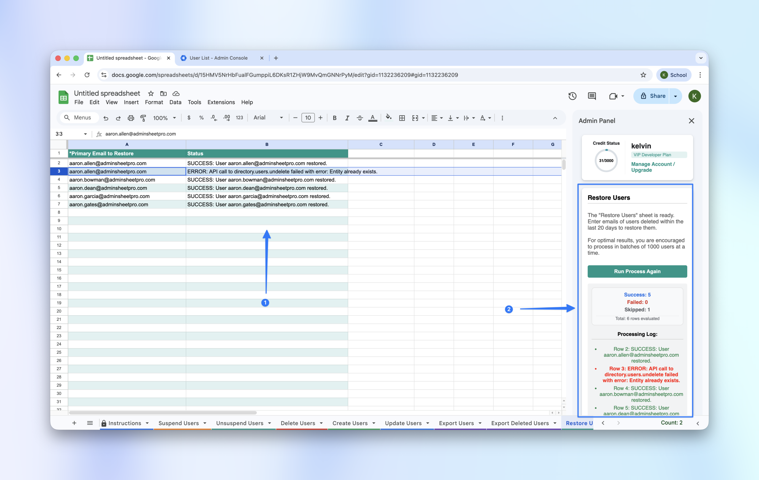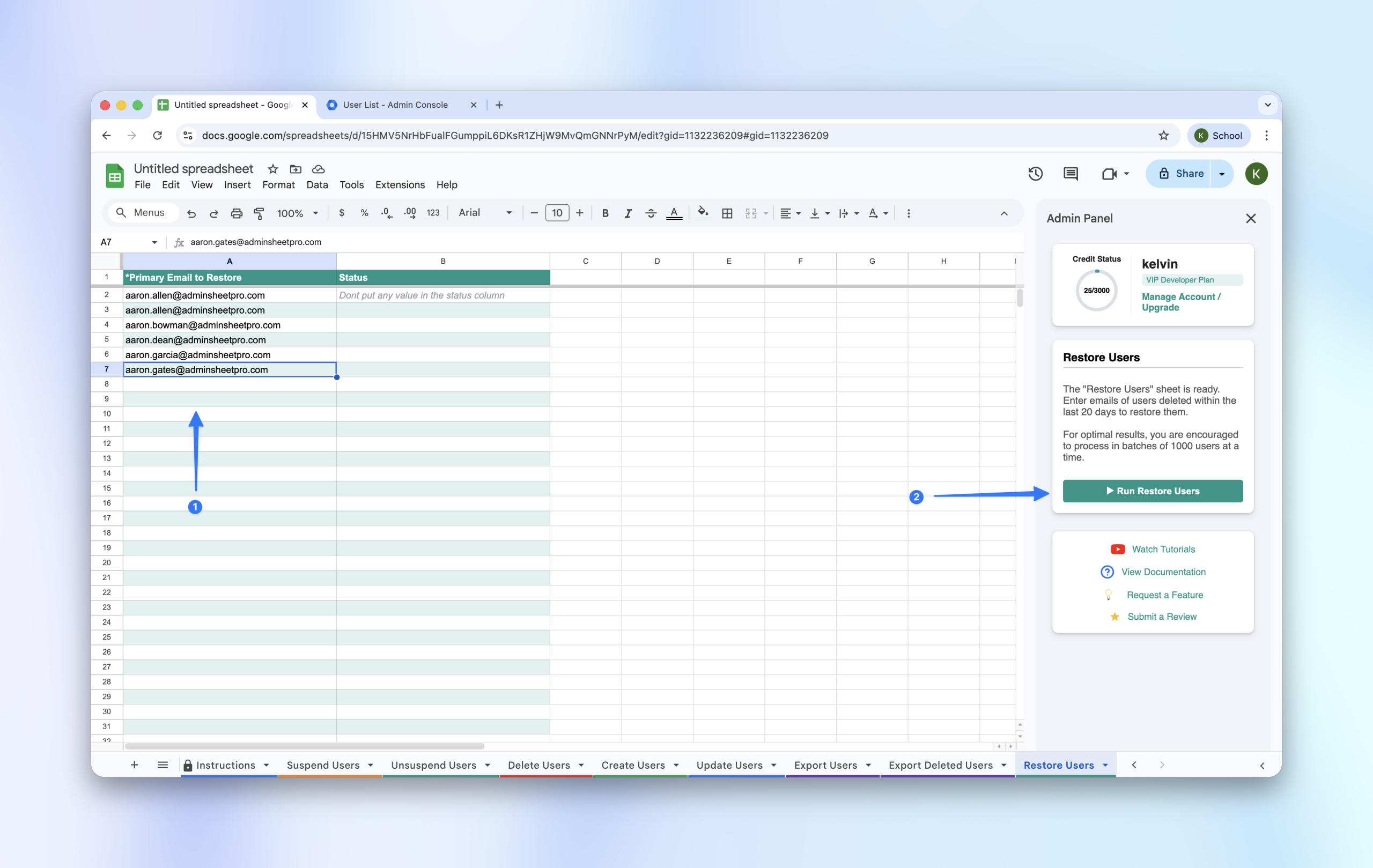 - Paste them into the Primary Email (*) column in the “Restore Users” sheet.