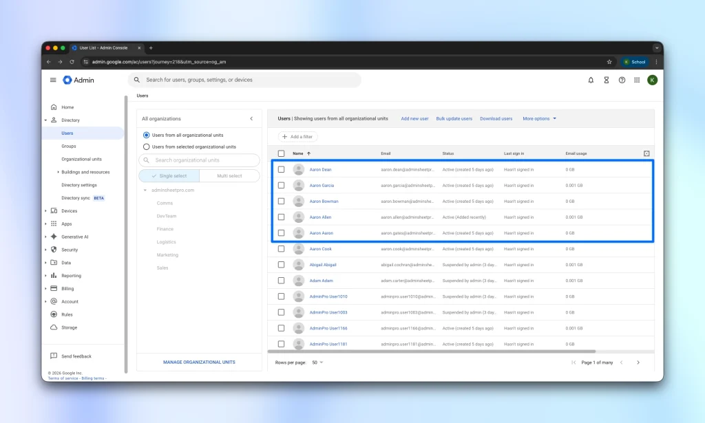 Finally, head over to your Google Workspace Admin Console and reload the user directory. You will find that the selected users are now unsuspended and active again.