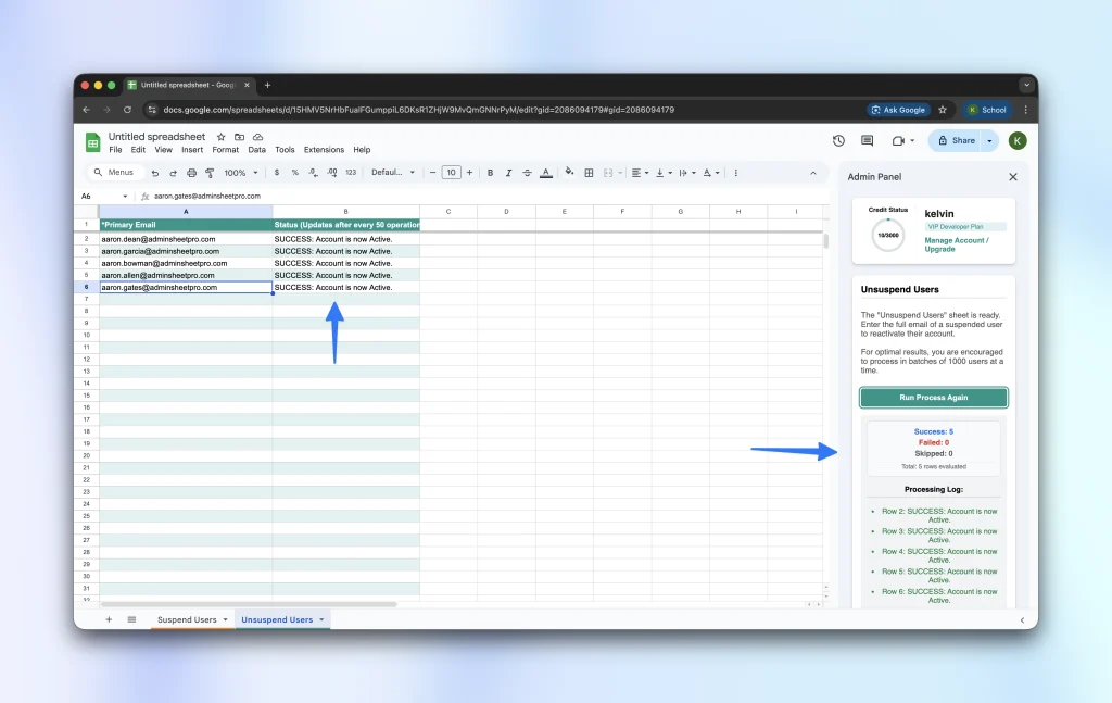 As it processes your list, AdminSheet Pro will update the Status column on your sheet, logging a SUCCESS or ERROR message for each email address.