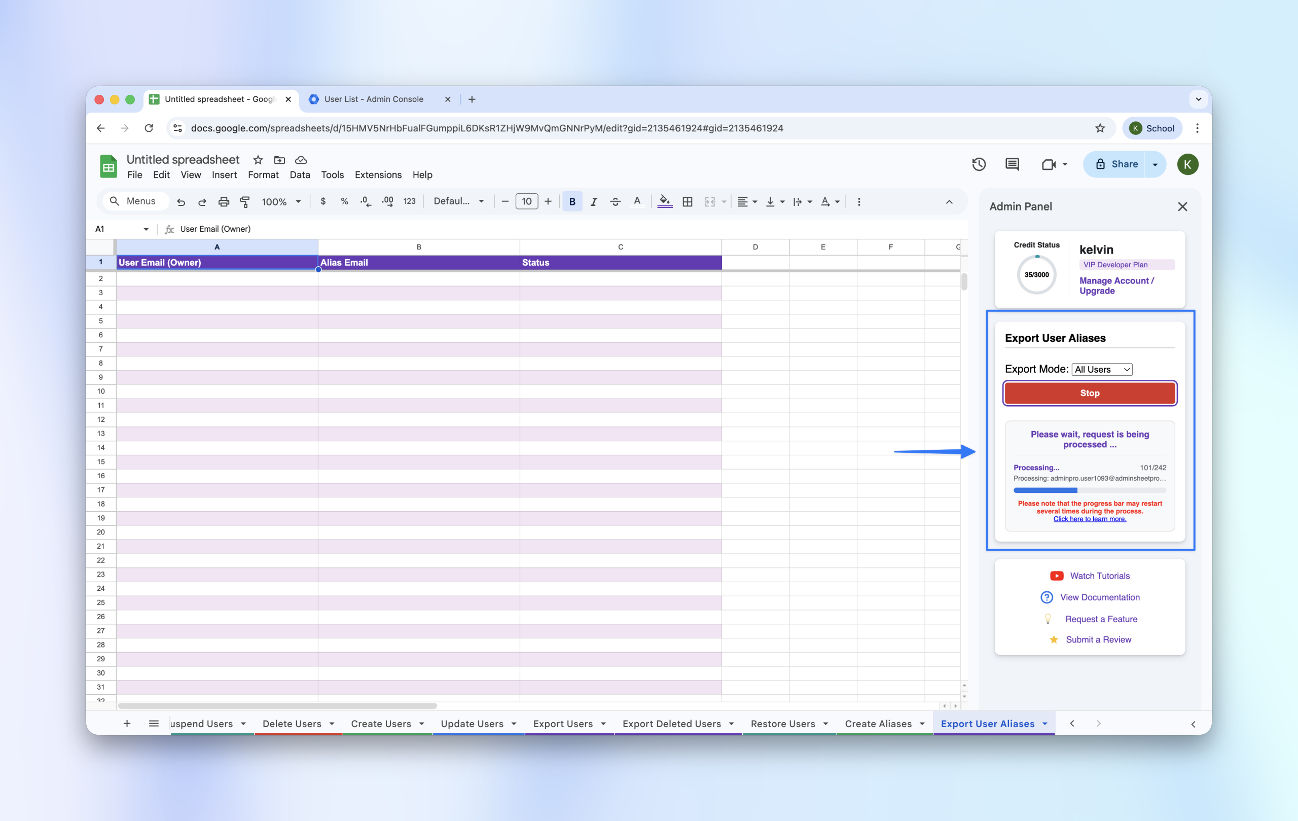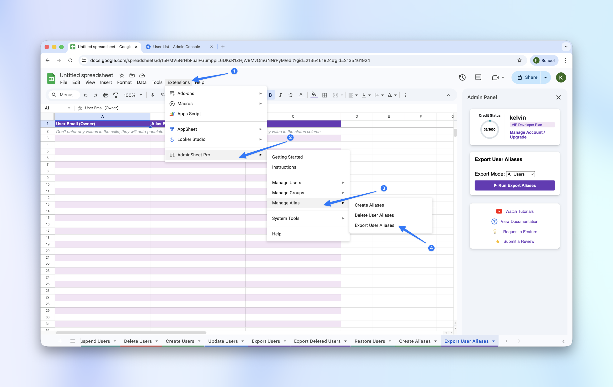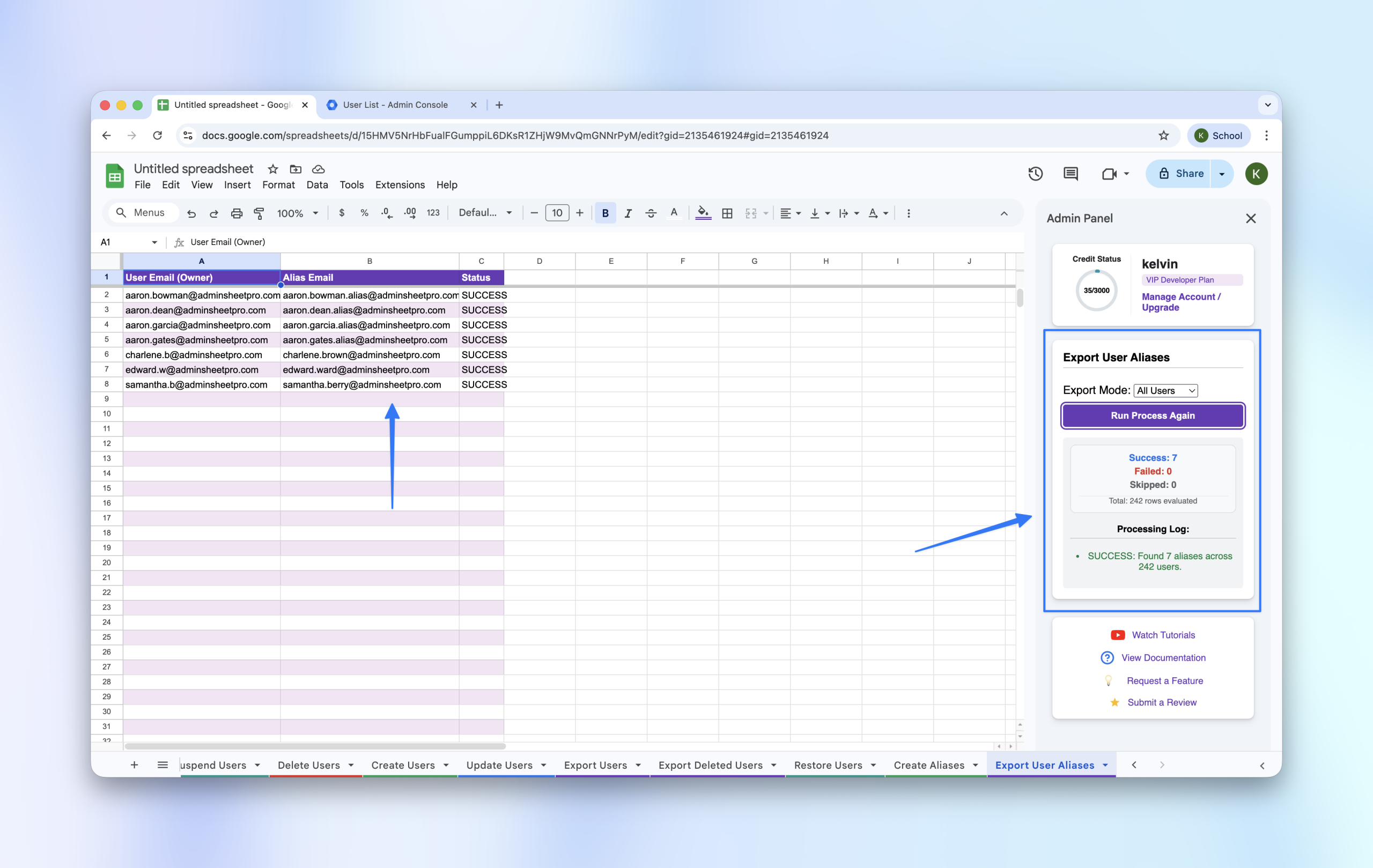 Auditing your domain’s email aliases is a critical part of directory management. AdminSheet Pro allows you to export all existing aliases into a single, organized spreadsheet for easy review.