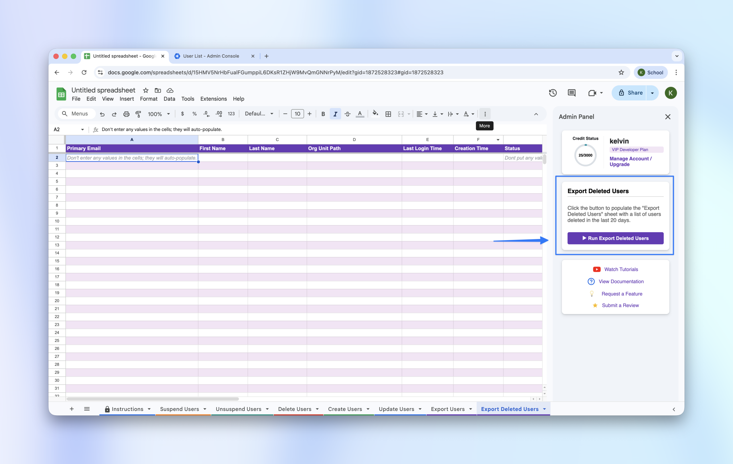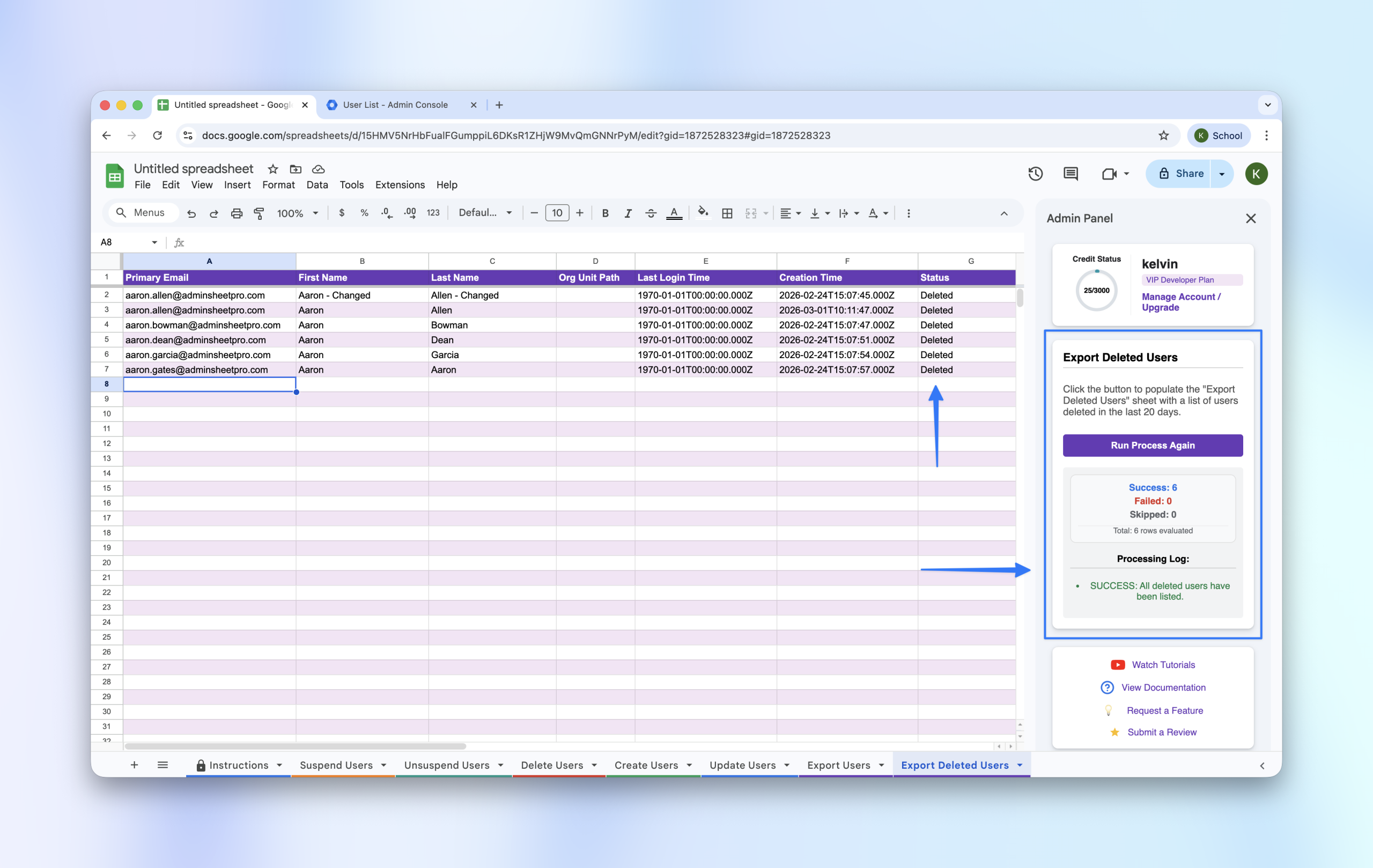 Google keeps records of deleted users for 20 days. AdminSheet Pro allows you to export this specific list into a spreadsheet, making it easy to identify accounts that can still be restored.