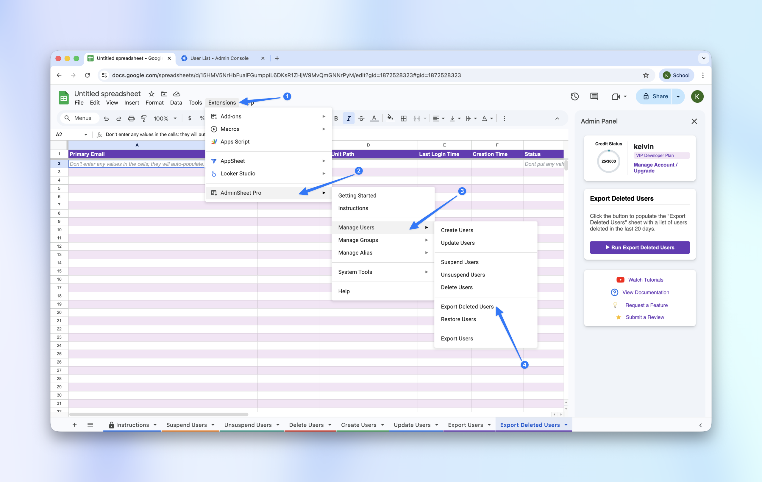 - In Google Sheets, navigate to Extensions > AdminSheet Pro > Manage Users.