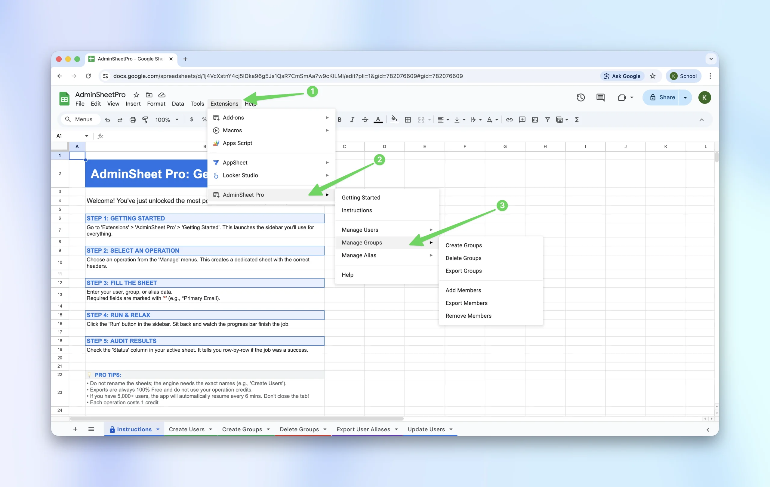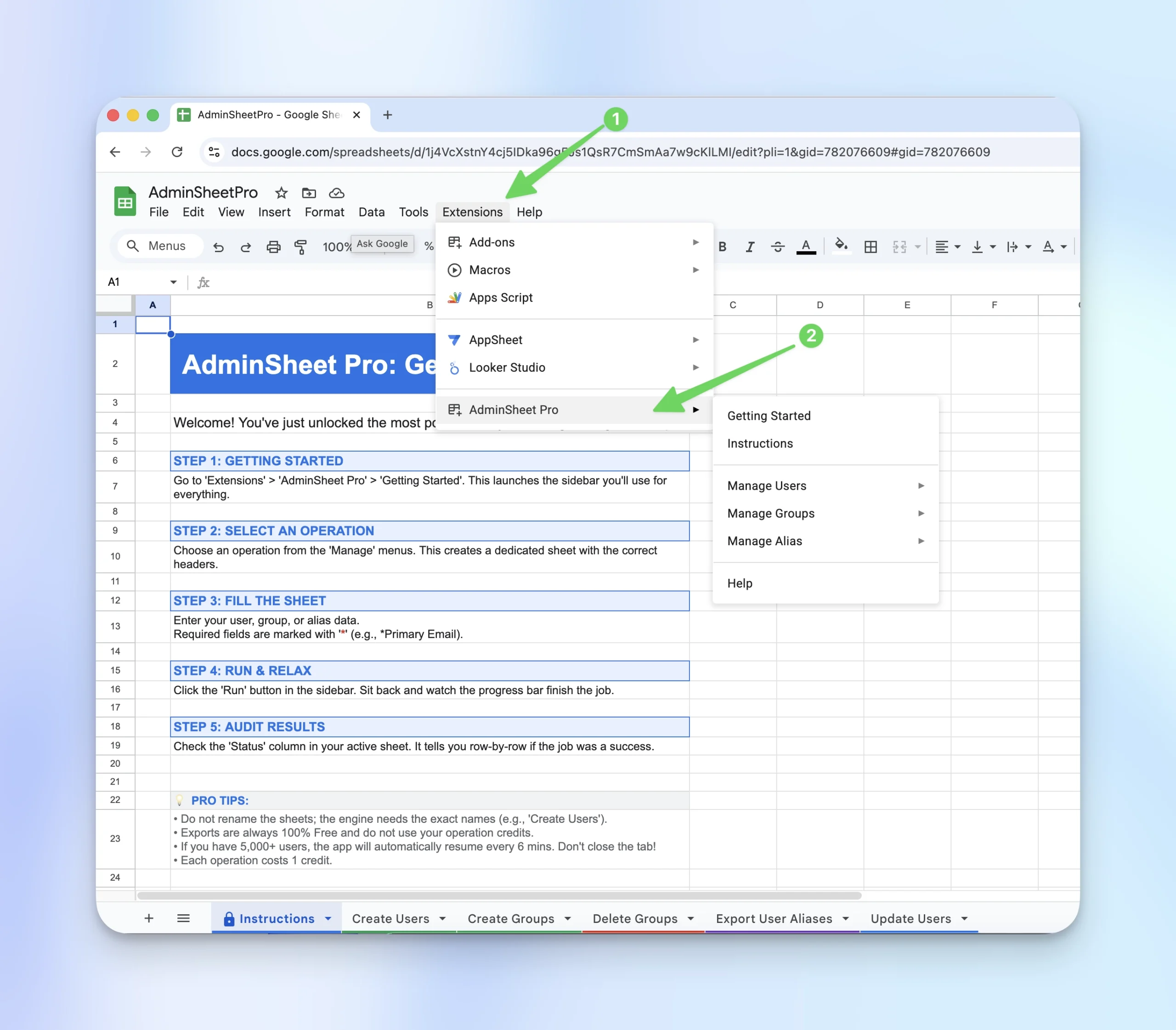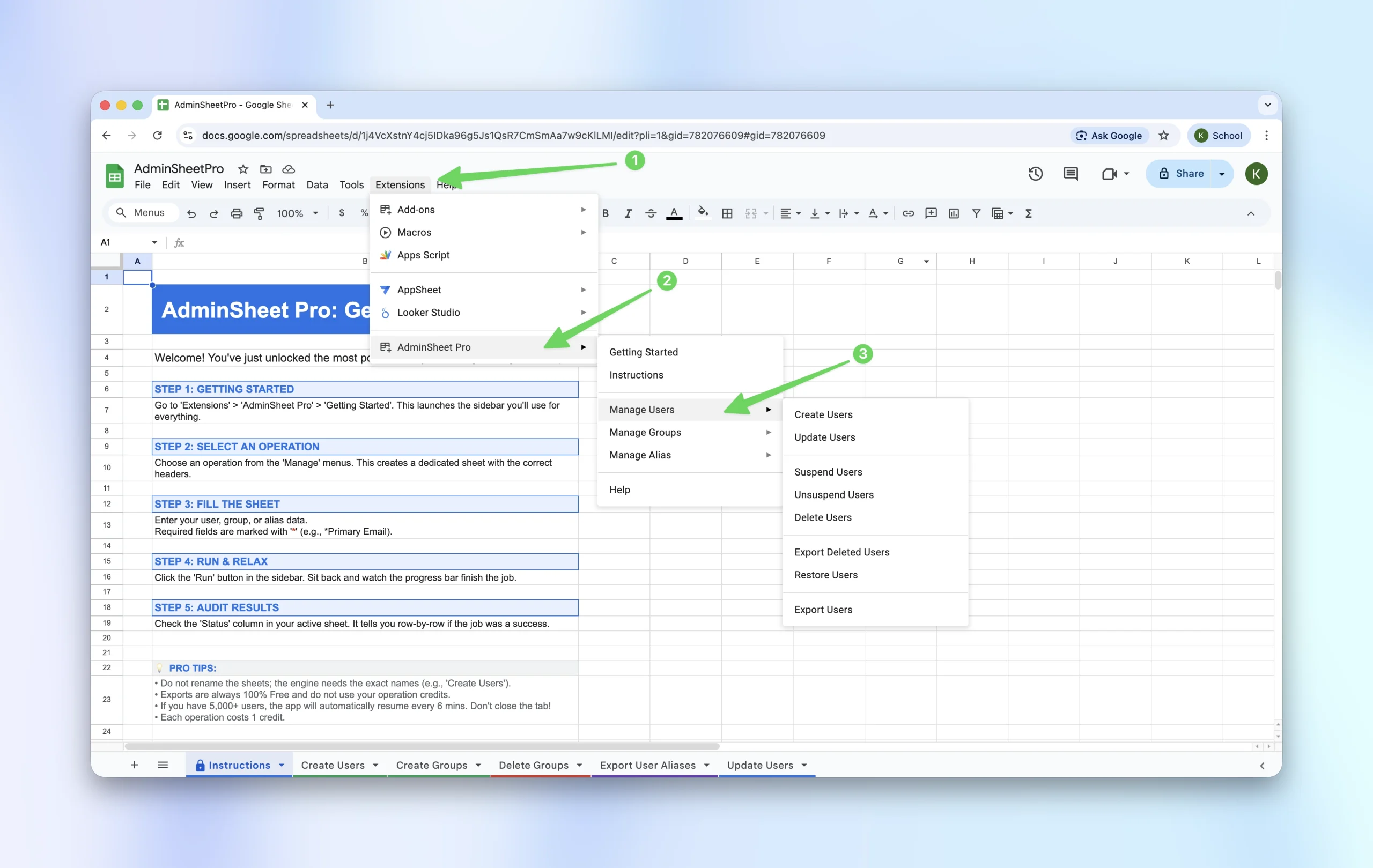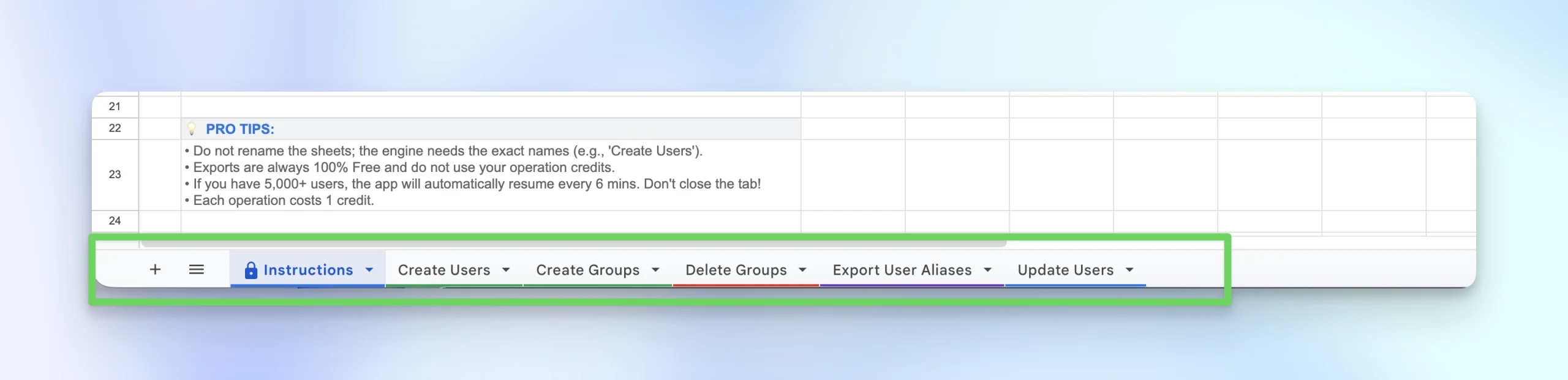 Each function in AdminSheet Pro, such as “Create Users”, is linked to a specific sheet. Selecting a function will automatically create the required sheet and navigate you to it. Please do not rename the sheets after they have been created.