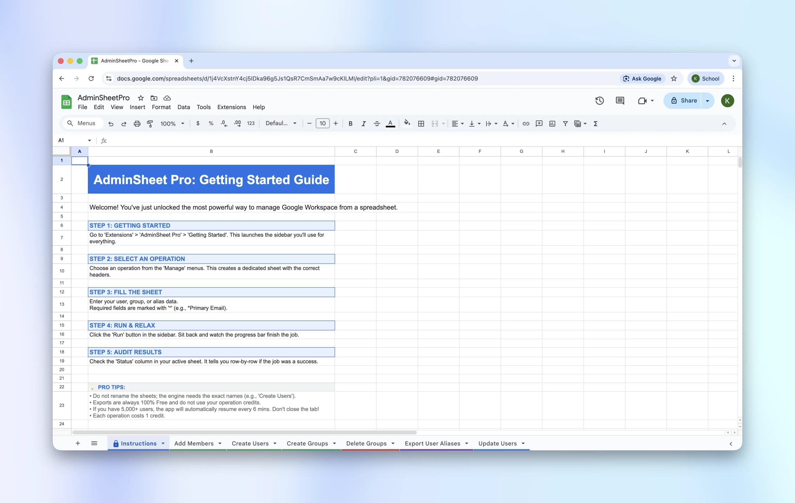 Welcome to AdminSheet Pro, a Google Sheets add-on designed by Google Workspace administrators for Google Workspace administrators. AdminSheet Pro is built to streamline bulk operations using Google Sheets—a simple and familiar interface.